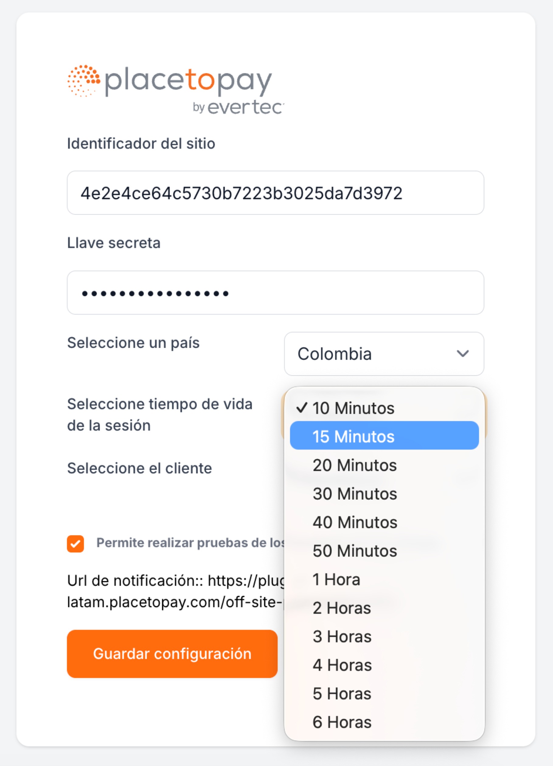 Este es el período de tiempo que se brindará al usuario para completar el proceso de pago; se sugiere un plazo de 10 a 15 minutos.